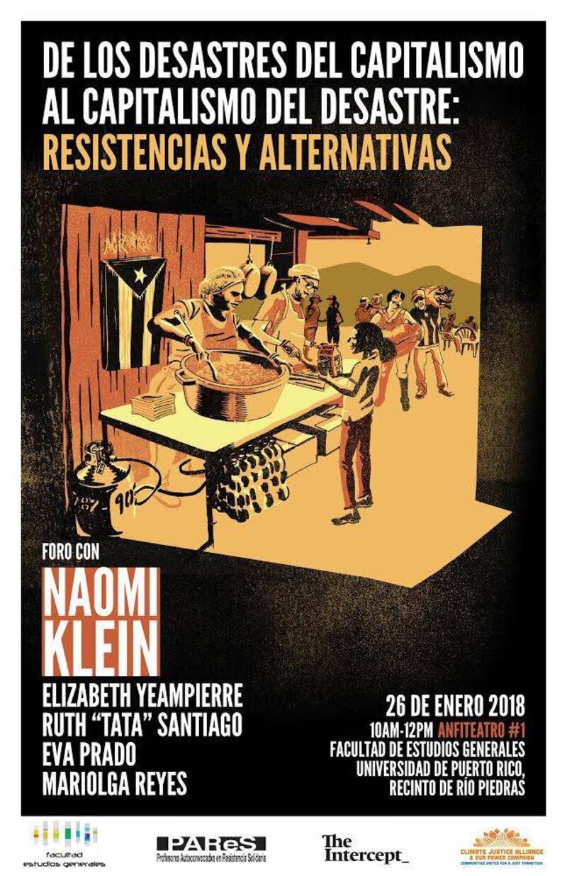 Las conferenciantes dialogarán sobre la violencia económica, política y social que mantiene a la población en estado de “shock”, tras el impacto de los huracanes Irma y María, y las posibles instancias de colaboración que hacen posible resistir y crear avenidas de mayor justicia y sostenibilidad para la gente. Esta actividad se realiza en colaboración con la Facultad de Estudios Generales, la Climate Justice Alliance y The Intercept.