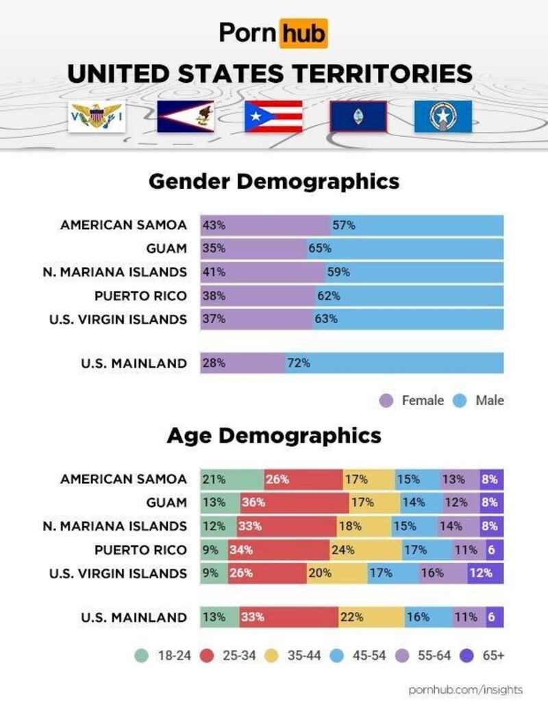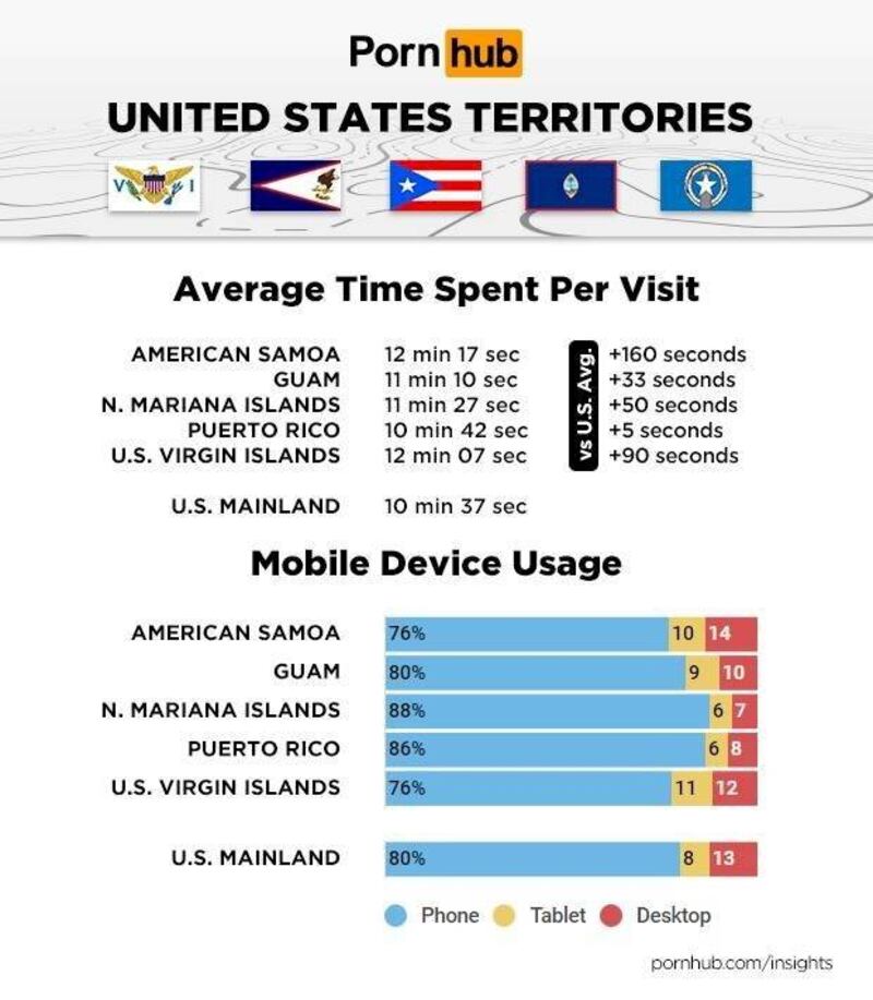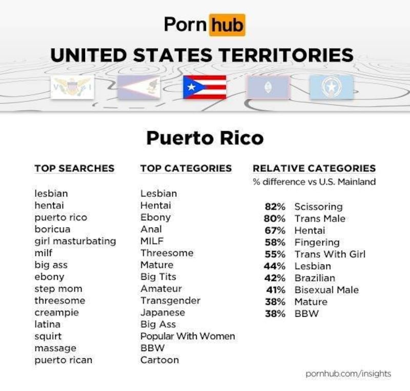 Las principales búsquedas realizadas en Puerto Rico son bajo las categorías “lesbianas” y “hentai”. También figura el patriotismo, pues en el motor de búsqueda los puertorriqueños escriben mucho “puerto rico” y “boricua”, según consta en los informes estadísticos de Pornhub hasta apenas noviembre 2019.
