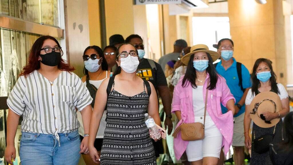 Visitantes portan mascarillas al caminar por una zona comercial en el sector de Hollywood AP