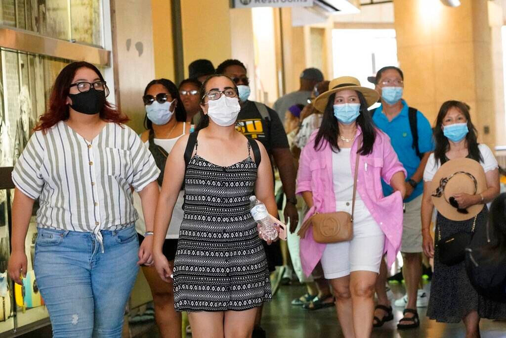 Visitantes portan mascarillas al caminar por una zona comercial en el sector de Hollywood AP