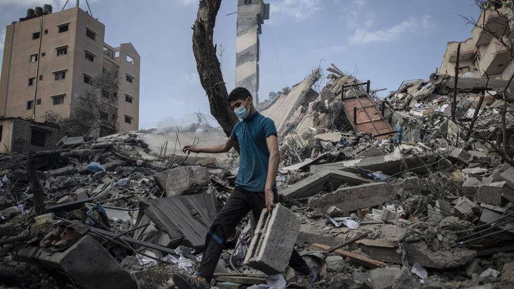 Los ataques derribaron un edificio que contenía bibliotecas y centros educativos de la Universidad Islámica. Vista desde un tejado, la escena era de un enorme valle de hierros y losas de concreto. Escritorios, oficinas, libros y cables informáticos asomaban entre los escombros. Residentes buscaban sus pertenencias entre los restos.