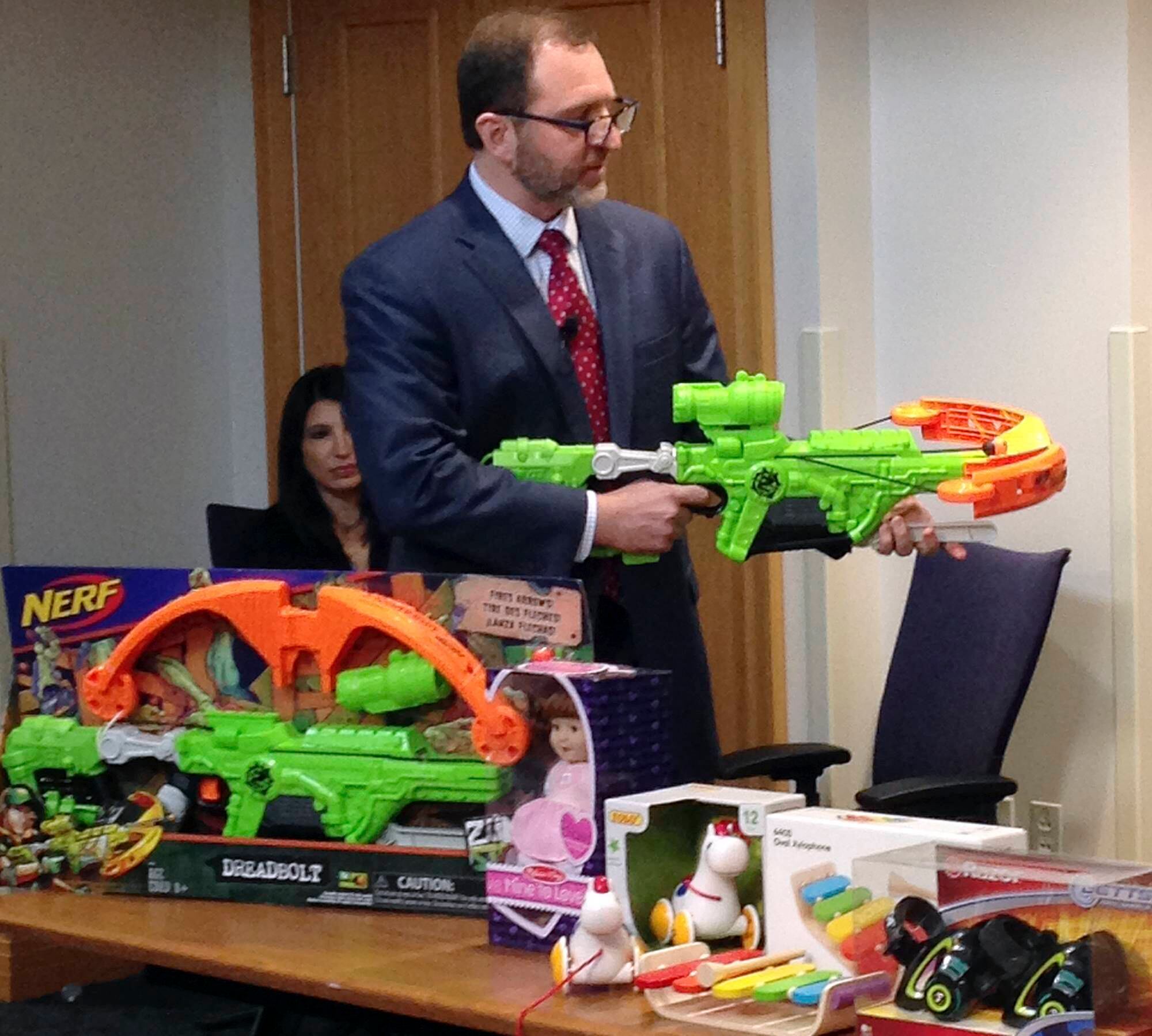 James Swartz, director de WATCH, una organización que revisa la seguridad de los juguetes, muestra la ballesta “Zombie Strike” de Nerf, en Boston, el 14 de noviembre de 2017. El grupo presentó su lista de los juguetes más peligrosos para los niños. (AP Foto/Philip Marcelo)