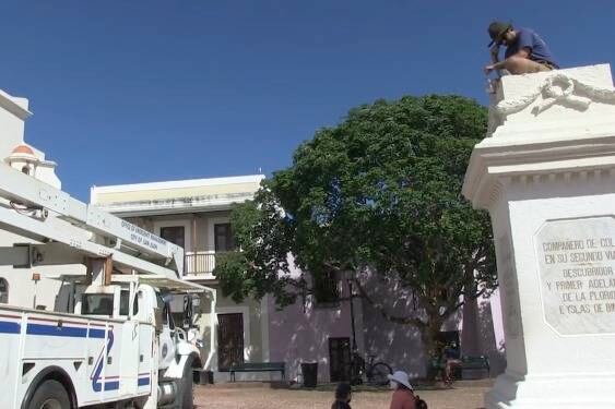 Un grupo de manifestantes impiden este lunes las labores de reconstrucción de la estatua de Juan Ponce de león en el Viejo San Juan.