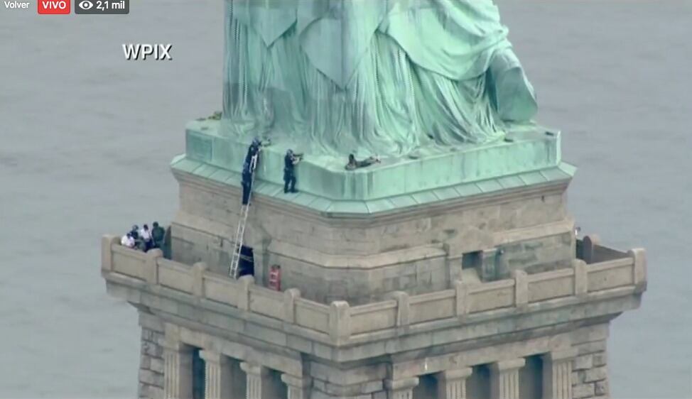 El portavoz del Servicio Nacional de Parques, Jerry Willis, dijo que el escalador -que varios medios nacionales reportan que se trata de una mujer- estaba en la base debajo del pie de la estatua. Willis dice que la policía está en lo alto de la base, aconsejando a la persona que baje.