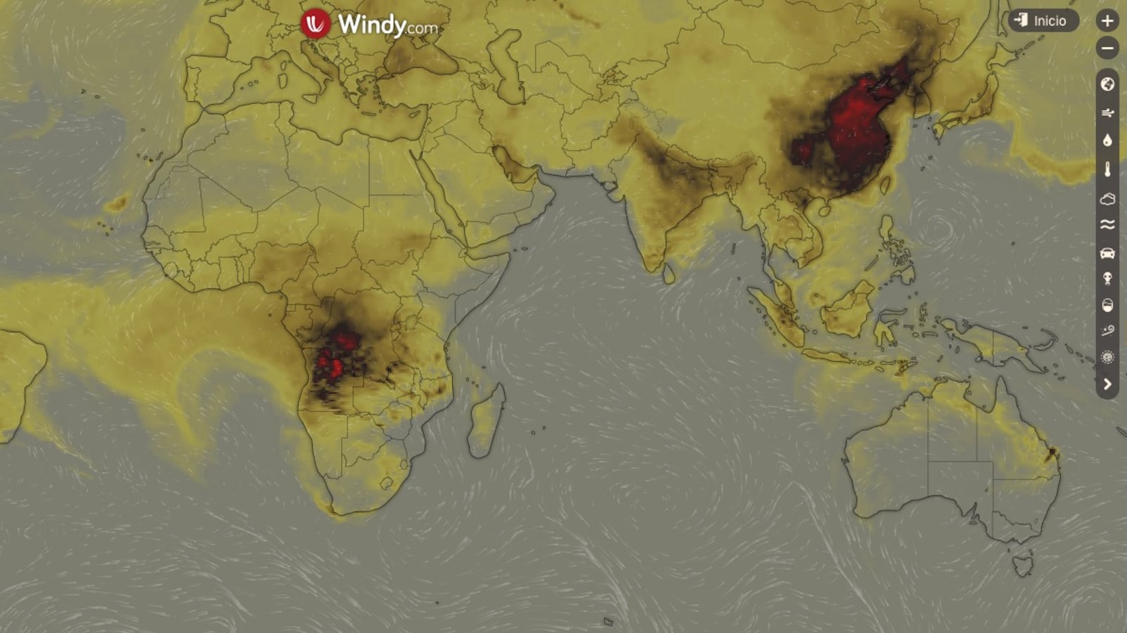 Así se ve en la imagen satelital de la plataforma Windy.com que muestra como las llamas destruyen enormes territorios también en China, Canarias, Bolivia, República Democrática del Congo, Angola, Alaska, Siberia y Rusia.