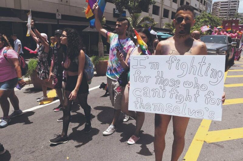 La lluvia, en ocasiones torrencial, no fue obstáculo para que cientos de personas se manifestaran desde el Parque del Indio en Condado hacia el Parque del Tercer Milenio en la celebración de la 29na. marcha Orgullo LGBTTIQ en Puerto Rico.