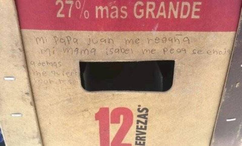 En un cartón de envases de cerveza había un recado donde una niña que se llama Camila pide auxilio, dice ser víctima de maltrato por parte de sus padres y que se quiere morir. Aún se desconoce la identidad de la menor, empero el mensaje causó revuelo e indignación al ser difundido en redes sociales.