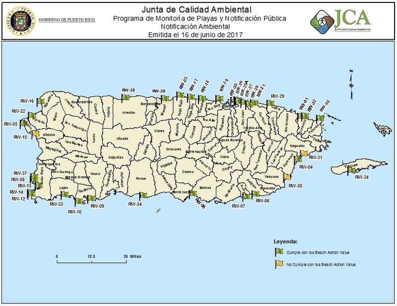 Luego de ser sometidas a los análisis correspondientes en el Laboratorio de Investigaciones Ambientales de Puerto Rico de la JCA en los muestreos del 14 y 15 de junio de 2017, las siguientes playas se encuentran bajo bandera amarilla: