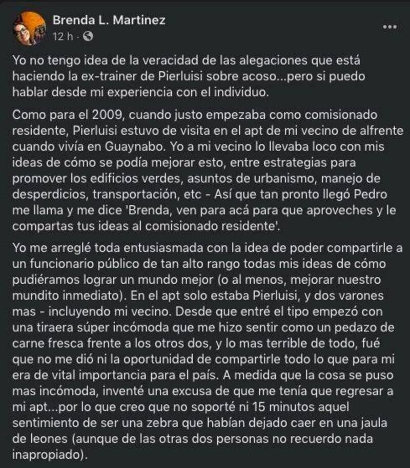 “Yo no tengo idea de la veracidad de las alegaciones que está haciendo la ex-trainer de Pierluisi sobre acoso…pero si puedo hablar desde mi experiencia con el individuo”, empieza a narrar en un post de Facebook que ya sobrepasaba las 1,200 veces compartido.