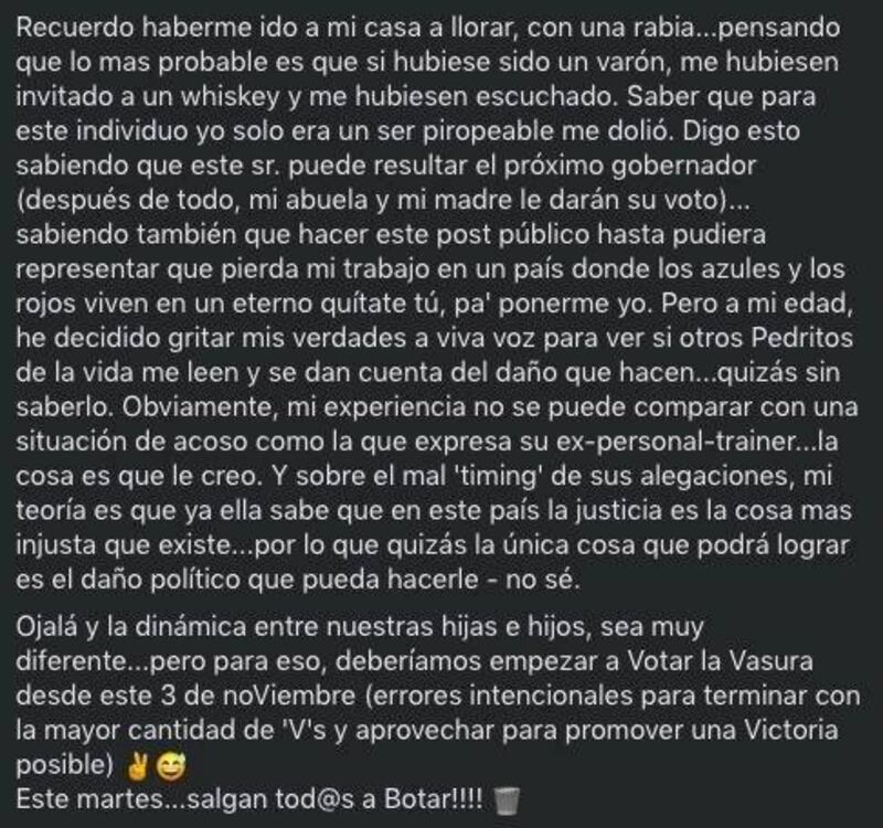 “Recuerdo haberme ido a mi casa a llorar, con una rabia…pensando que lo mas probable es que si hubiese sido un varón, me hubiesen invitado a un whisky y me hubiesen escuchado. Saber que para este individuo yo solo era un ser piropeable me dolió. Digo esto sabiendo que este señor puede resultar el próximo gobernador (después de todo, mi abuela y mi madre le darán su voto)… sabiendo también que hacer este post público hasta pudiera representar que pierda mi trabajo en un país donde los azules y los rojos viven en un eterno quítate tú, pa’ ponerme yo. Pero a mi edad, he decidido gritar mis verdades a viva voz para ver si otros Pedritos de la vida me leen y se dan cuenta del daño que hacen…quizás sin saberlo. Obviamente, mi experiencia no se puede comparar con una situación de acoso como la que expresa su ex-personal-trainer…la cosa es que le creo. Y sobre el mal ’timing’ de sus alegaciones, mi teoría es que ya ella sabe que en este país la justicia es la cosa mas injusta que existe…por lo que quizás la única cosa que podrá lograr es el daño político que pueda hacerle – no sé”, manifestó, en plena consciencia de la denuncia que hacía.