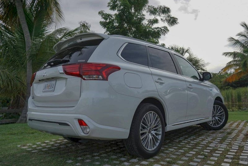 Para ser un modelo ya bastante maduro dentro de su ciclo, me sorprendió la cantidad de atención y comentarios que la Outlander PHEV generó en la calle. No estoy seguro si fue el body kit o el notable spoiler trasero pero más de una persona se vió atraída por la apariencia. Aunque lucen un tanto pequeños, me gustó mucho el diseño de los aros de 18 pulgadas exclusivos del modelo PHEV. El interior es simplemente funcional y espacioso, ni más ni menos. La posición de manejo es un punto fuerte por ser bien semejante a la de un SUV tradicional y la ergonomía es buena aunque curiosamente carece de una ruedita para ajustar rápidamente el volumen o cambiar estaciones. Por otro lado, la Outlander PHEV ofrece conexión para Apple CarPlay y Android Auto que ya son una exigencia del mercado. Los pasajeros del asiento trasero gozan de un amplio espacio y tomas de USB para conectar sus dispositivos electrónicos. También cuenta con dos salidas de 1,500 vatios en la que se puede conectar algo tan simple como una computadora hasta algo mucho más grande, en resumen, convierte al vehículo en una especie de generador portátil.