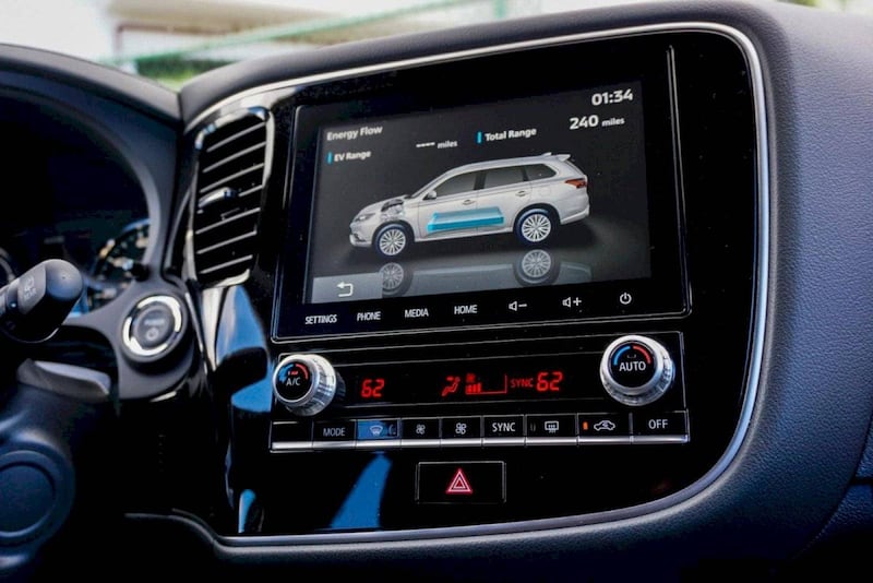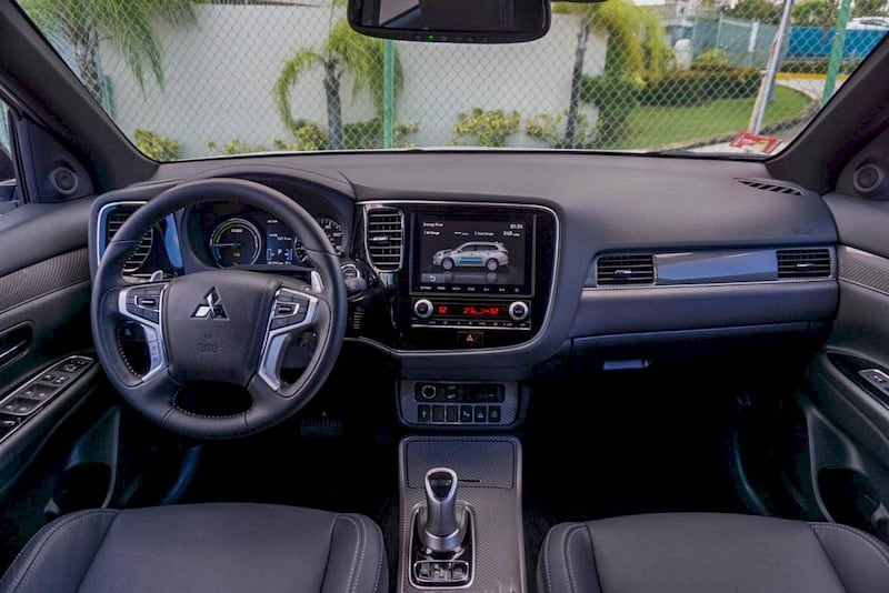Para ser un modelo ya bastante maduro dentro de su ciclo, me sorprendió la cantidad de atención y comentarios que la Outlander PHEV generó en la calle. No estoy seguro si fue el body kit o el notable spoiler trasero pero más de una persona se vió atraída por la apariencia. Aunque lucen un tanto pequeños, me gustó mucho el diseño de los aros de 18 pulgadas exclusivos del modelo PHEV. El interior es simplemente funcional y espacioso, ni más ni menos. La posición de manejo es un punto fuerte por ser bien semejante a la de un SUV tradicional y la ergonomía es buena aunque curiosamente carece de una ruedita para ajustar rápidamente el volumen o cambiar estaciones. Por otro lado, la Outlander PHEV ofrece conexión para Apple CarPlay y Android Auto que ya son una exigencia del mercado. Los pasajeros del asiento trasero gozan de un amplio espacio y tomas de USB para conectar sus dispositivos electrónicos. También cuenta con dos salidas de 1,500 vatios en la que se puede conectar algo tan simple como una computadora hasta algo mucho más grande, en resumen, convierte al vehículo en una especie de generador portátil.