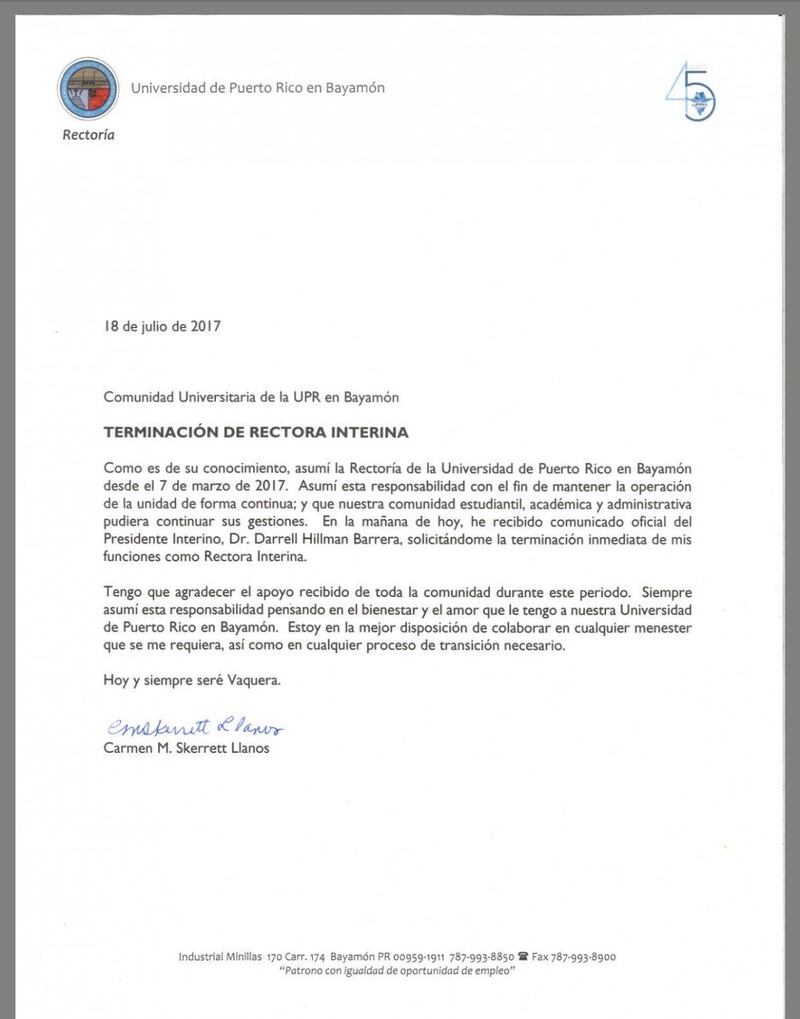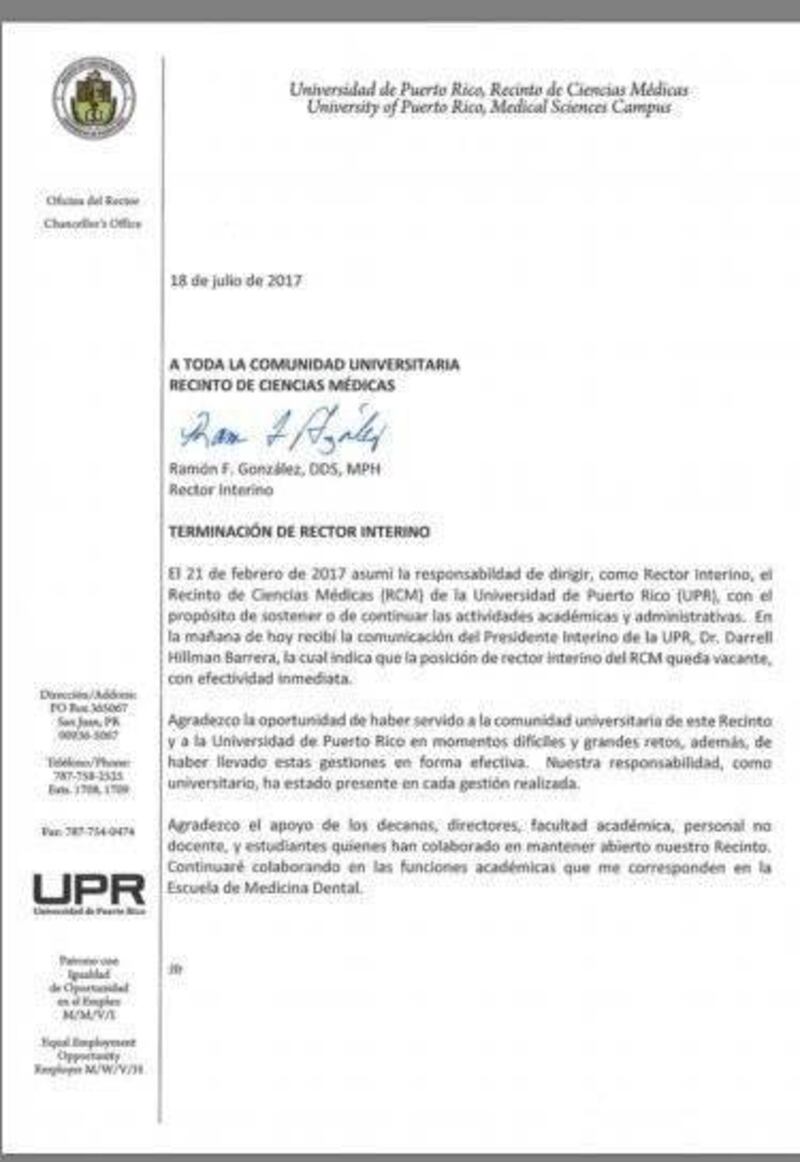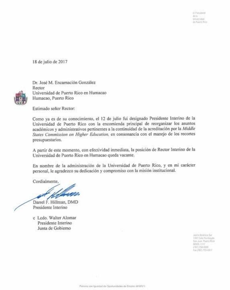 Una carta del presidente interino Hillman, en la cual se le destituía, le llegó a Encarnación una hora antes de nuestra entrevista. En total, fuero despojados de sus cargos: Herminia Alemañy, de la UPR Aguadilla; Doris Torres Negrón, de Ponce; Carmen Skerrett Llanos, de Bayamón; Ramón González, de Ciencias Médicas; John Fernández Van Cleve, de Mayagüez; Mario Medina Cabán, de Cayey; Moisés Orengo Avilés, de Carolina; Sylka Torres Navas, de Arecibo; y Raquel Vargas Gómez, de Utuado.