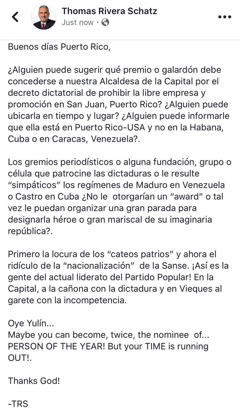 Si esto fuese básquet, el olímpico Manuel 'Manolo' Rivera Morales hubiese dicho que el presidente del Senado Thomas 'Tommy' Rivera Schatz – conocido como Sharknado en los billares de St. Just – “ha tirado un recital” con su estatus de esta mañana en Facebook, el cual dedicó a la Cruella De Vil de la estadidad, Carmen Yulín Cruz Soto.
