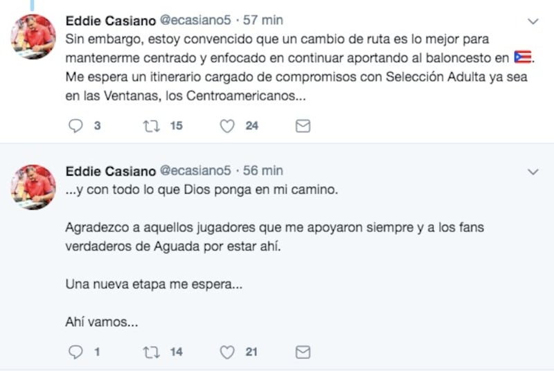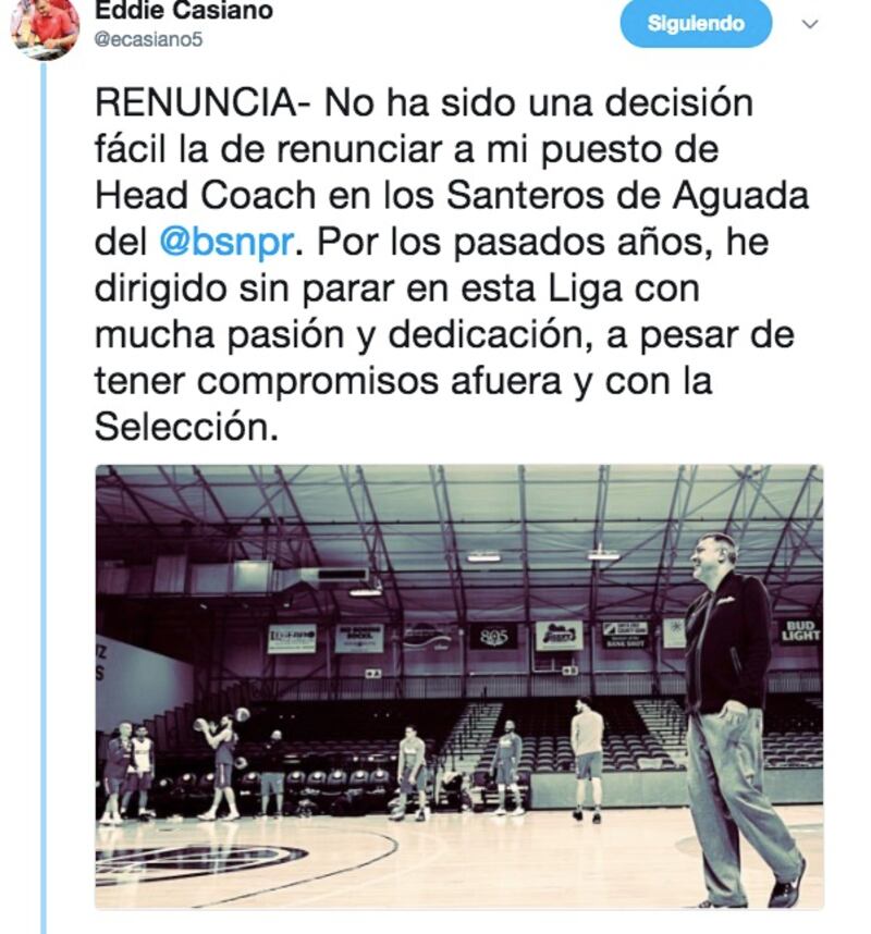 “No ha sido una decisión fácil la de renunciar a mi puesto de Head Coach en los Santeros de Aguada del Baloncesto Superior Nacional. Por los pasados años, he dirigido sin parar en esta Liga con mucha pasión y dedicación, a pesar de tener compromisos afuera y con la Selección”, estableció Casiano en su cuenta de Twitter.