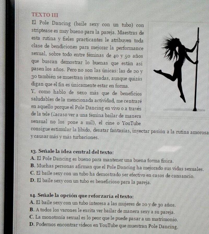 En la sección III de la publicación se toca el tópico del pole dancing, indicando que la actividad es muy buena para la pareja y que mejora el “performance” sexual, sobre todo en féminas de entre 40 y 50 años.
