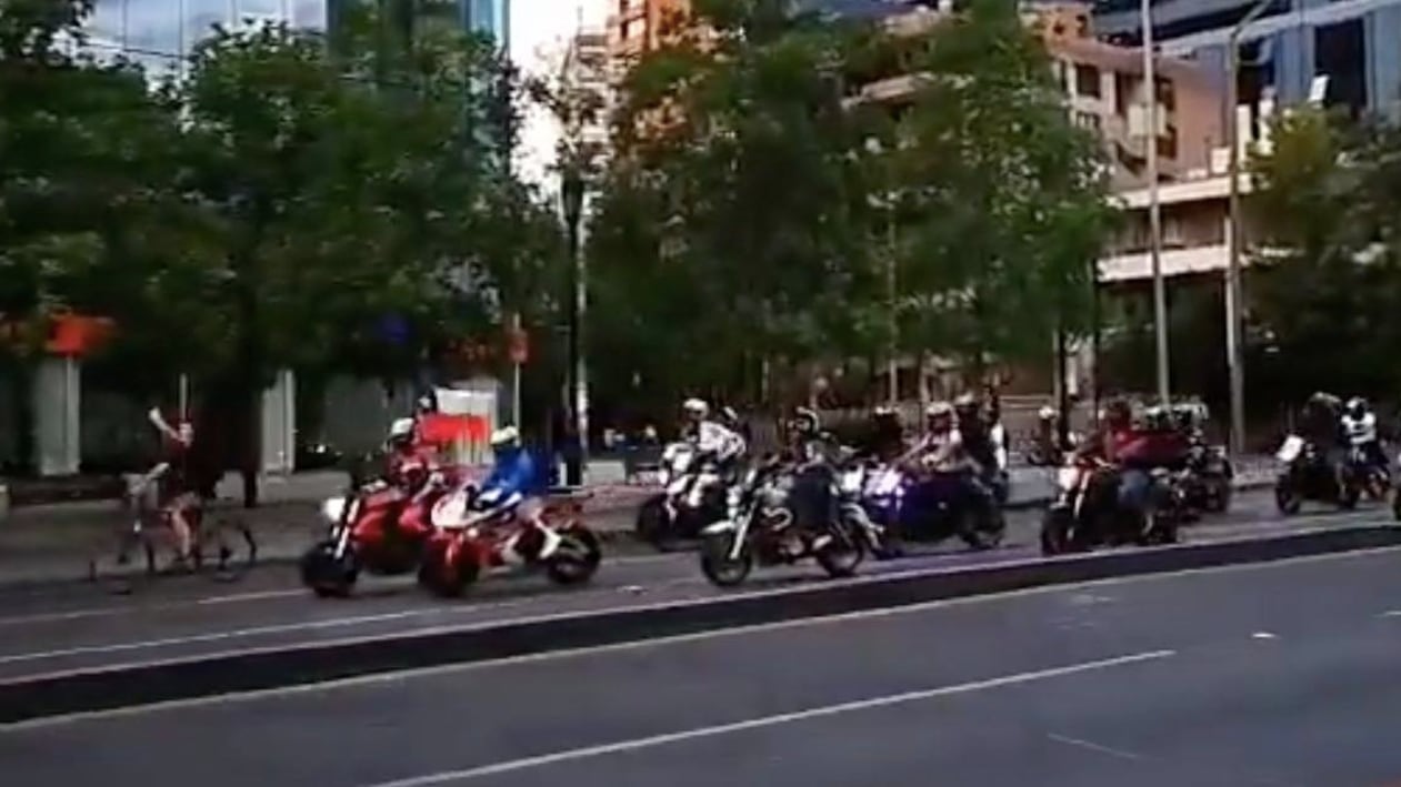 En el video captado por nuestro equipo que capturó la potente imagen de 500 motoqueros. Sus máquinas avanzan hacia la masiva convocatoria en Plaza Italia. Sin embargo el escenario que los espera es confuso, ya que al centro de la convocatoria se registra una fuerte represión de parte de Carabineros hacia los manifestantes. La situación se produce en medio de una marcha pacífica.