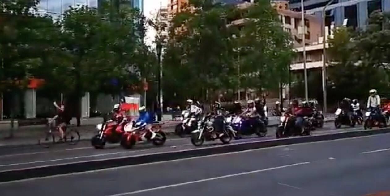 En el video captado por nuestro equipo que capturó la potente imagen de 500 motoqueros. Sus máquinas avanzan hacia la masiva convocatoria en Plaza Italia. Sin embargo el escenario que los espera es confuso, ya que al centro de la convocatoria se registra una fuerte represión de parte de Carabineros hacia los manifestantes. La situación se produce en medio de una marcha pacífica.