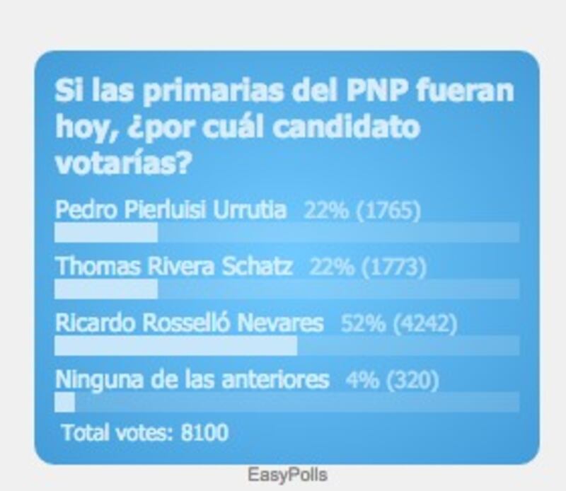 La encuesta, que estuvo disponible por más de 12 horas, enfrentó a Pedro Pierluisi, Ricky Rosselló y a Tommy Rivera Schatz. Además, se añadió, para analizar la percepción de los candidatos, un espacio de ninguna de las anteriores. Esta opción obtuvo 4%.