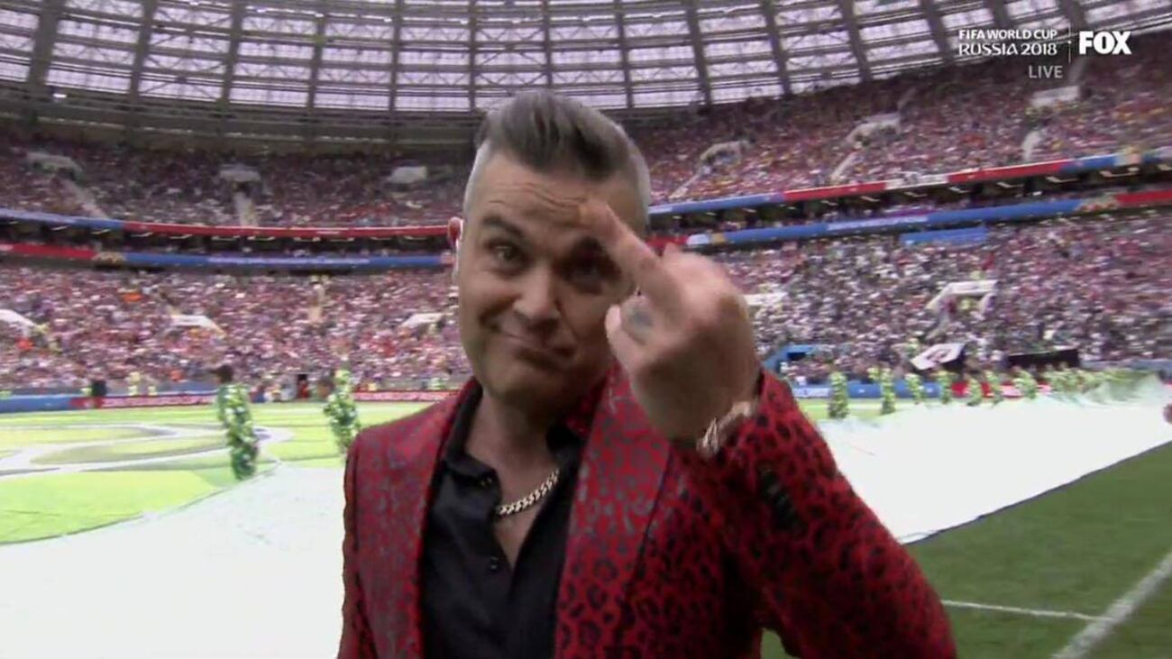 El astro británico Robbie Williams hizo una seña obscena durante su actuación del jueves en la ceremonia inaugural en la Copa del Mundo en Rusia.