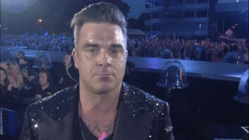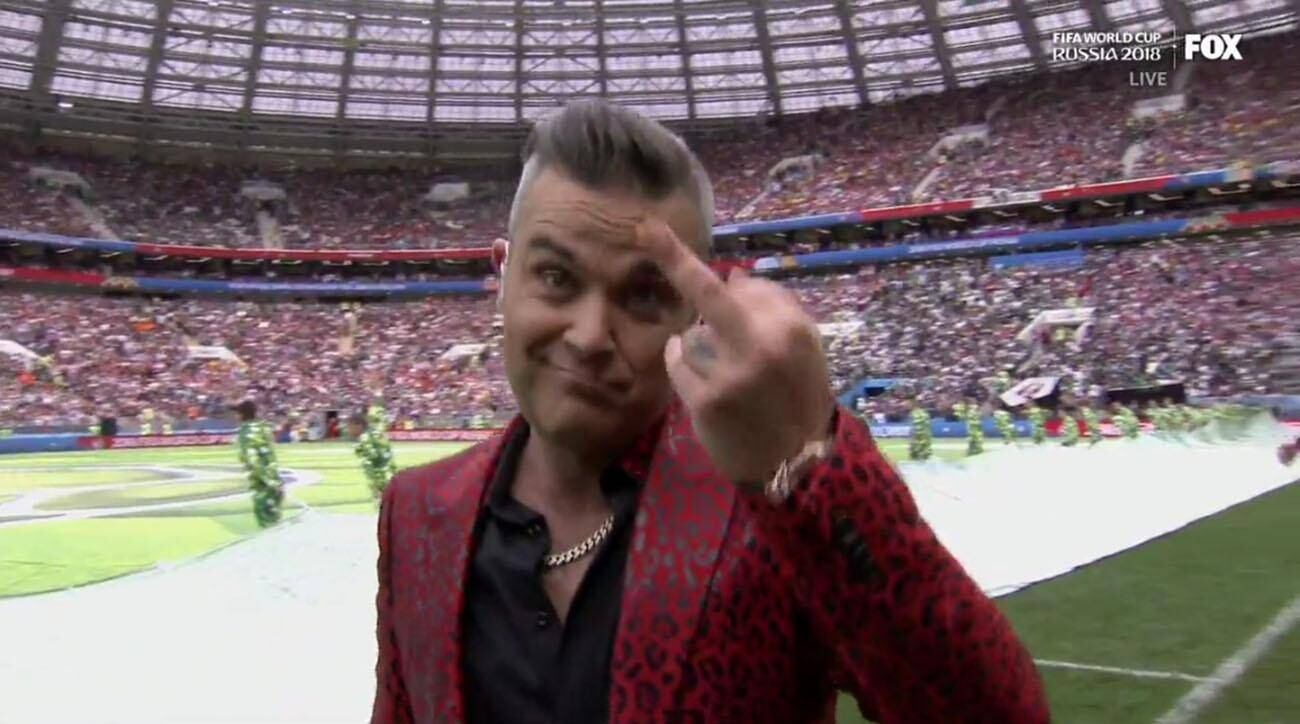 El astro británico Robbie Williams hizo una seña obscena durante su actuación del jueves en la ceremonia inaugural en la Copa del Mundo en Rusia.