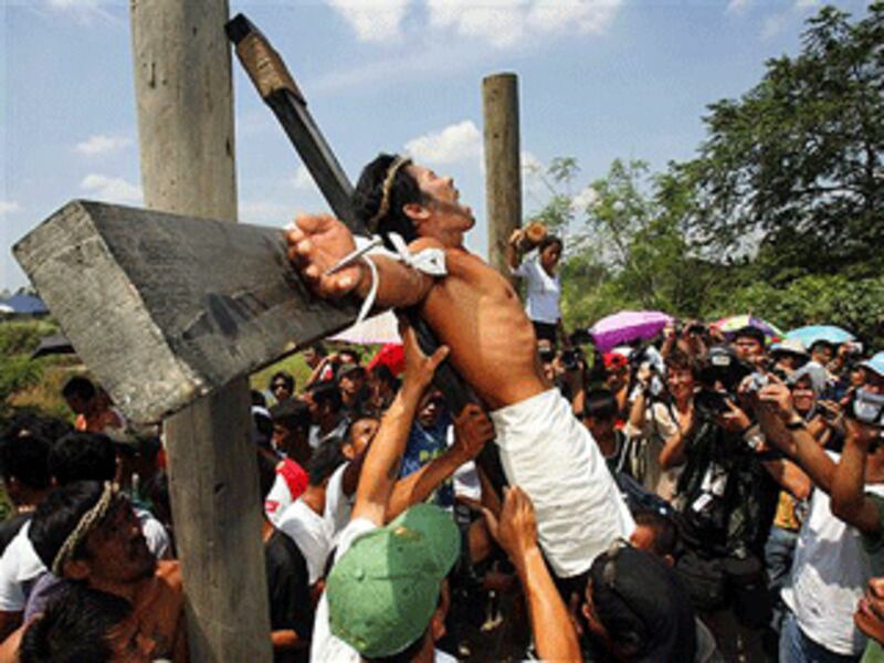 Encuentro un video del Viernes Santo en Filipinas. ¡¡¡Ah!!! Hardcoroso de verdad. Olvídense de las procesiones bonitas de las que se dan en Bayamón y Guaynabo. No, en las procesiones filipinas hay sangre, la estampa es dura. Eso de clavarte en la cruz es real.