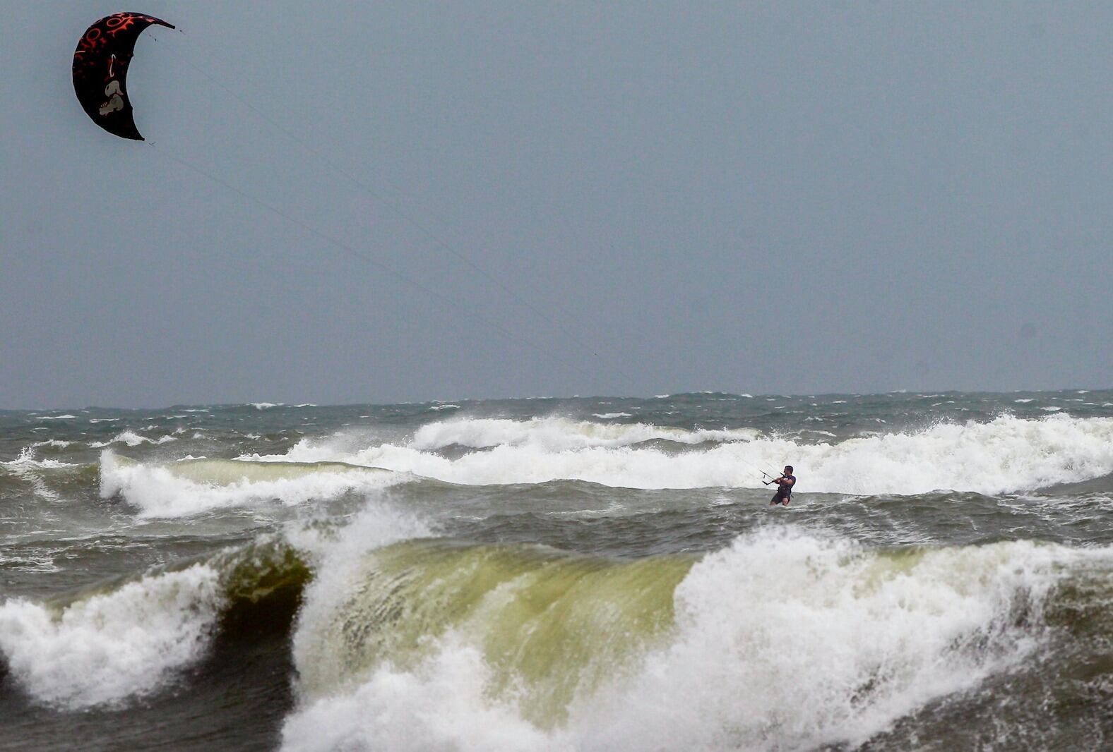 Un surfista de cometa aprovecha los vientos y las olas fuertes en Juno Beach, Florida, el lunes 2 de septiembre de 2019, mientras el huracán Dorian avanza lentamente frente a la costa de Florida. AP