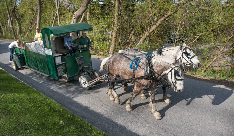 La recolección de basuras no suele ser un acto merecedor de una foto. Pero este es un espectáculo que hace que los niños esperen en las veredas para ver a los grandes percherones moteados, y que los transeúntes tomen fotos y videos con sus celulares desde sus autos.