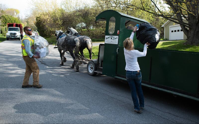 Dos veces por semana, caballos de tiro remolcan un carro al trote por vecindarios de Middlebury, mientras Patrick Palmer y sus dos empleados lanzan las bolsas de basura y reciclaje desde la acera a la carreta.