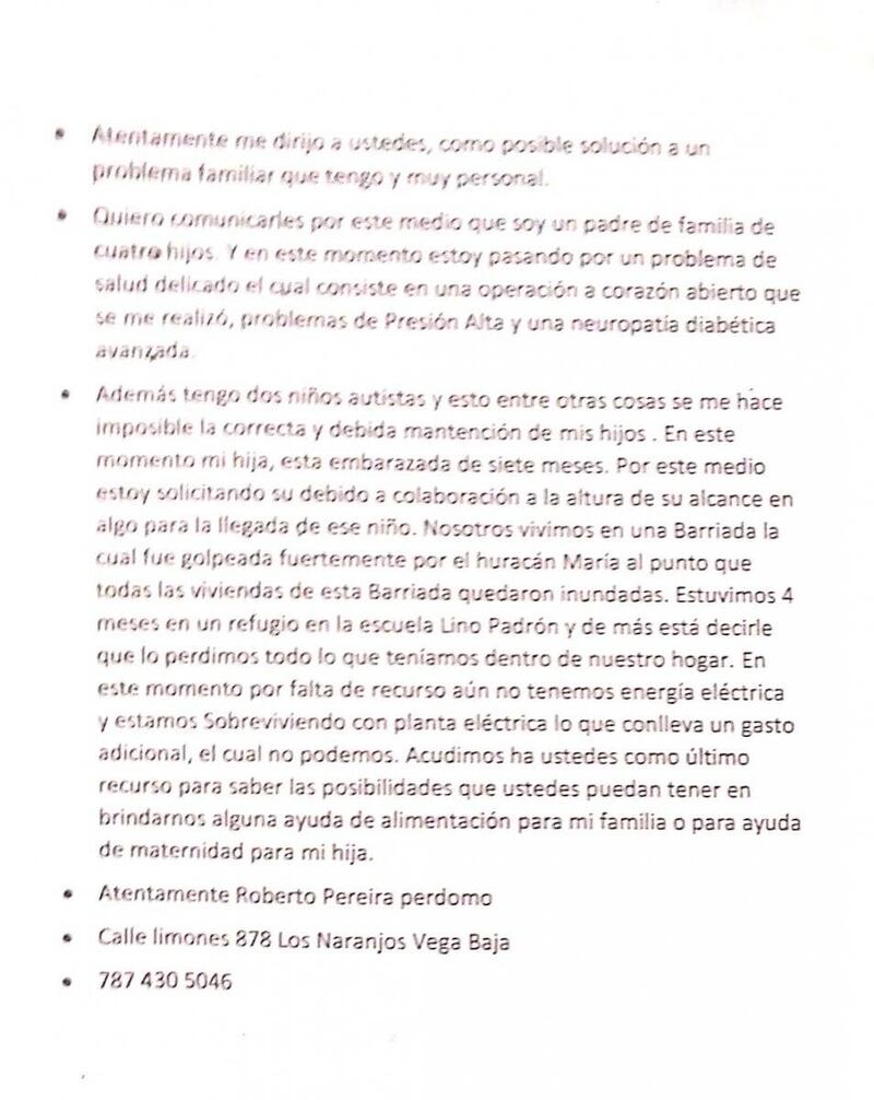 “Desde el huracán estaban con planta eléctrica y el señor estaba buscando ayuda. Andaba negocio por negocio pasando un papel, porque tiene dos nenes autistas”, le dijo Vega a El Calce. Roberto, el padre, había sido operado del corazón y sufre también de neuropatía diabética.