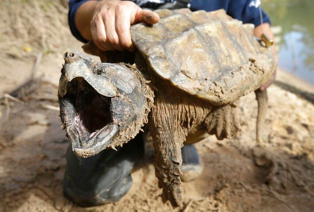 Las tortugas caimán pueden vivir hasta 80 años, y se sabe de machos que pesan hasta 113 kilogramos (249 libras) con caparazones de hasta 74 centímetros (29 pulgadas) de longitud. Sus mandíbulas tienen la fuerza suficiente para romper huesos.