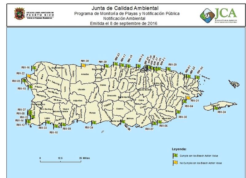 La Junta de Calidad Ambiental informó que tres playas no están aptas para bañistas debido a que se detectaron bacterias Enterococos (indicador) en concentraciones que superan los parámetros de calidad determinado en los muestreos tomados los días 7 y 6 de septiembre de 2016.