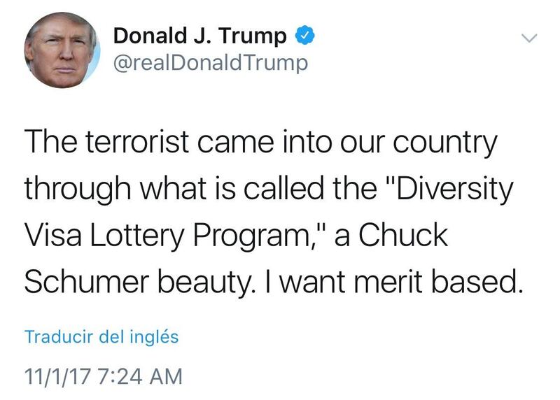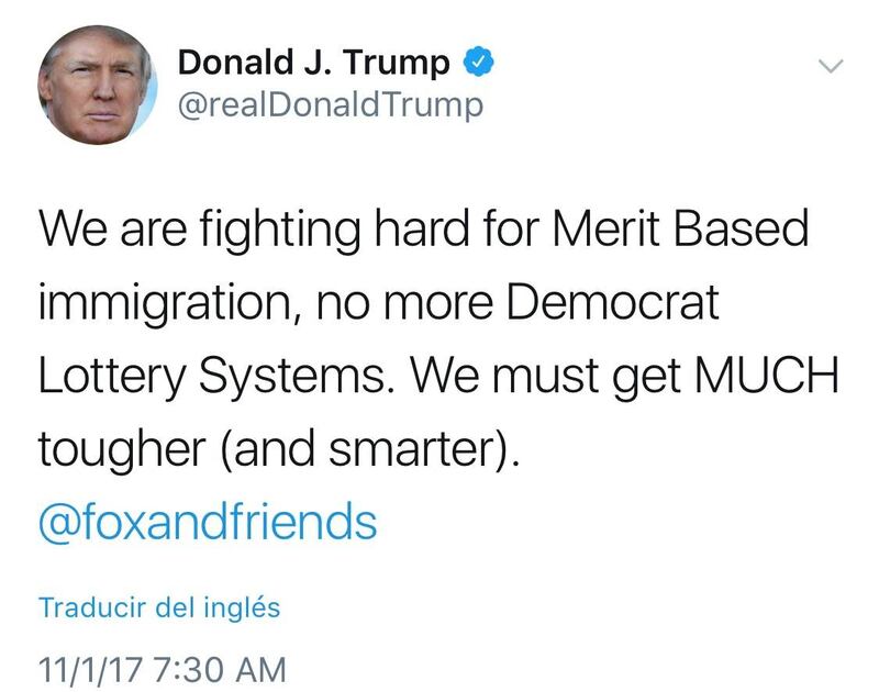 En una serie de tuits, Trump se hizo eco de una información de varios medios, entre ellos la cadena ABC, que asegura que el sospechoso del atentado, Sayfullo Saipov, un uzbeco de 29 años, llegó a EEUU hace siete años gracias a una lotería de visados a la que acceden naciones que tienen pocos inmigrantes en el país.