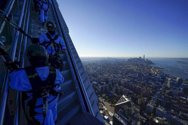 Los escaladores reciben arneses ligados a rieles que usan para subir por escaleras al aire libre, desde un primer puesto de observación conocido como el Cliff hasta la plataforma más alta, el Apex, a 387 metros (1.271 pies) de altura, sobre la Décima Avenida.