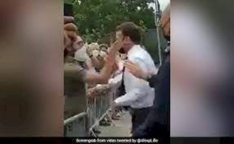 En el video, Macron regresó brevemente a la barrera después del incidente y una vez más interactuó con la multitud.