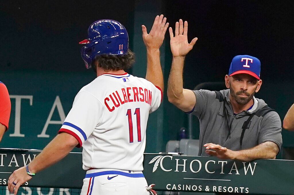 Charlie Culberson, Chris Woodward Charlie Culberson (11) de los Rangers de Texas recibe el saludo del manager Chris Woodward tras anotar una carrera ante los Marineros de Seattle, el sábado 13 de agosto de 2022. (AP Foto/LM Otero) (LM Otero/AP)