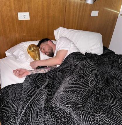 A través de su Instagram, Messi compartió una fotografía en la que se encuentra durmiendo junto al trofeo de la Copa del Mundo que ganó junto a su equipo tras vencer a Francia en la final de Qatar 2022 el pasado domingo.