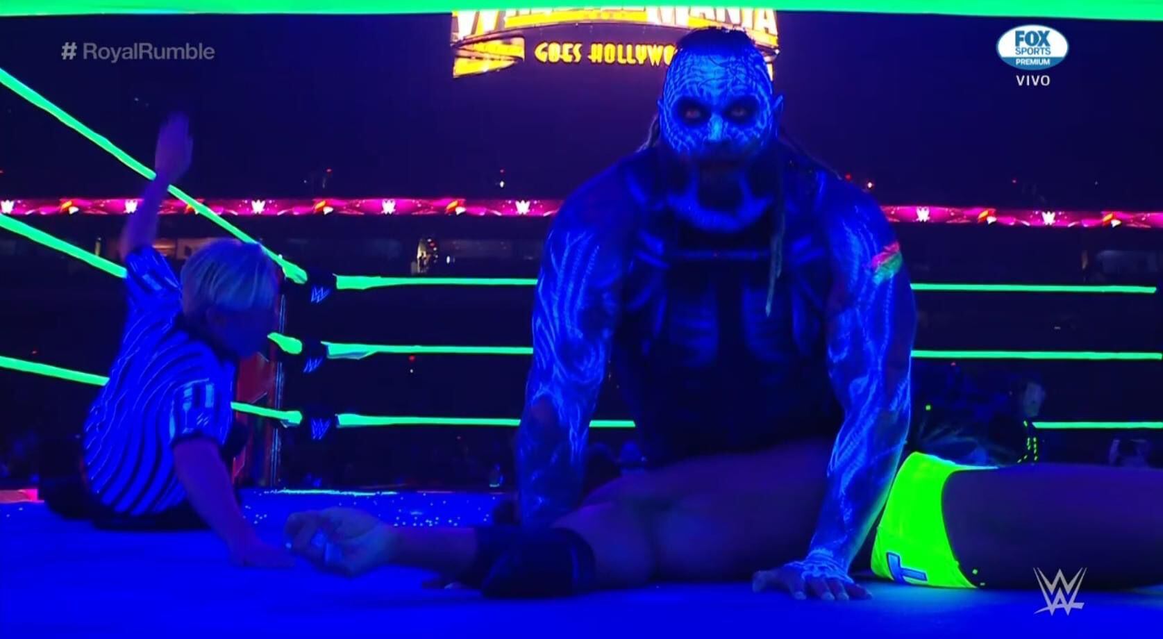 Éste se lanzó desde el tope del escenario hacia una rampa de madera sobre LA Knight. Hay un total de 51,338 fanáticos presentes en el Alamo Dome de San Antonio presenciando Royal Rumble.