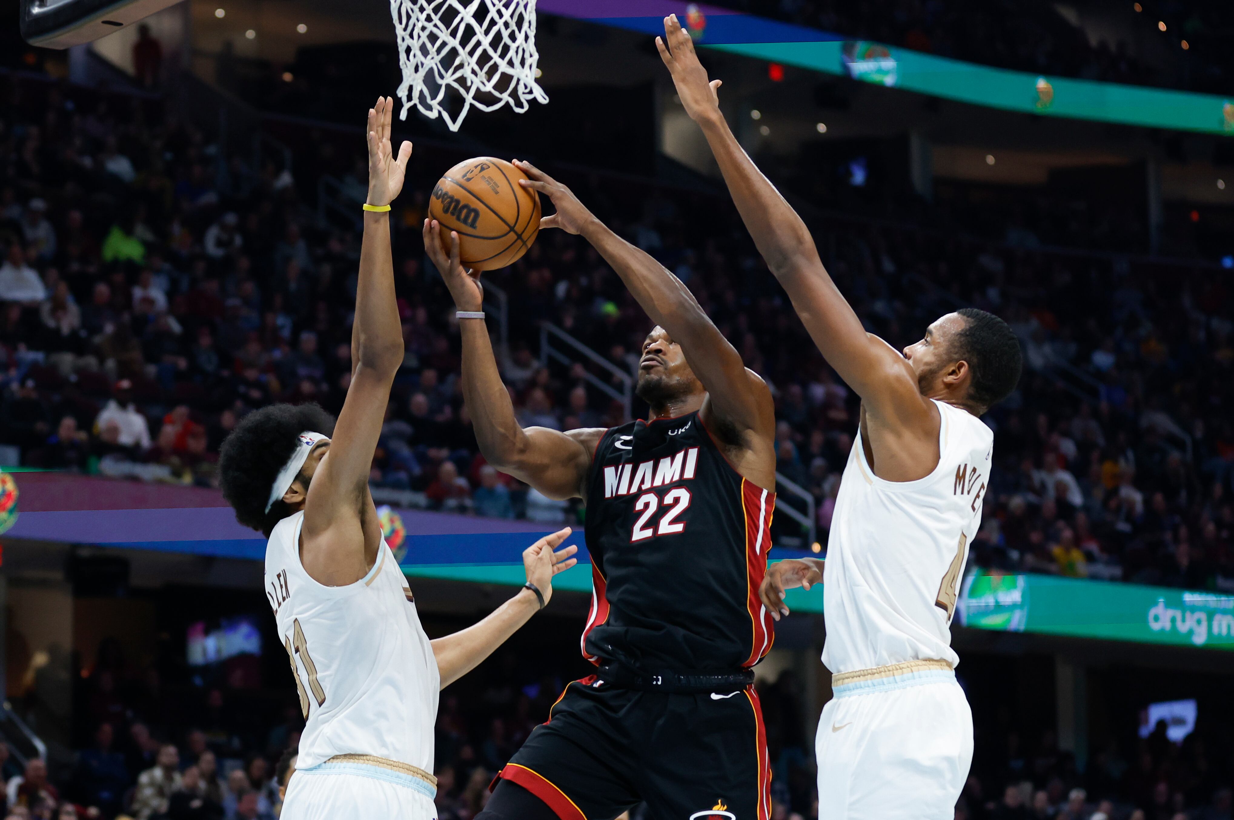 Jimmy Butler, alero del Heat de Miami, salta entre Jarrett Allen y Evan Mobley, de los Cavaliers de Cleveland, en el partido de la NBA realizado el martes 31 de enero de 2023 (AP Foto/Ron Schwane) AP (Ron Schwane/AP)