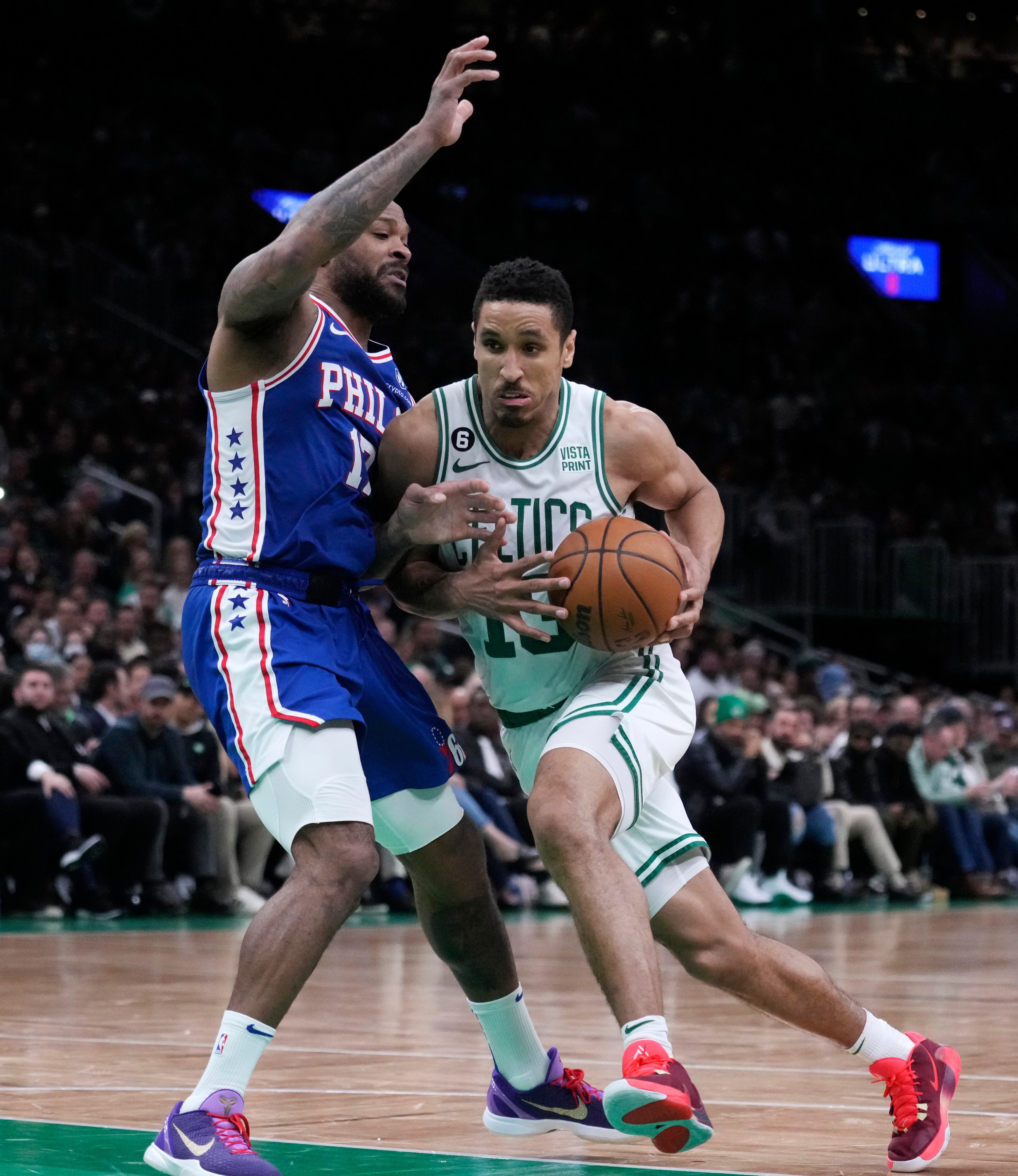 Malcolm Brogdon, de los Celtics de Boston, avanza hacia la canasta frente a P.J. Tucker, de los 76ers de Filadelfia, en la segunda mitad del encuentro del miércoles 8 de febrero de 2023 (AP Foto/Charles Krupa) AP (Charles Krupa/AP)