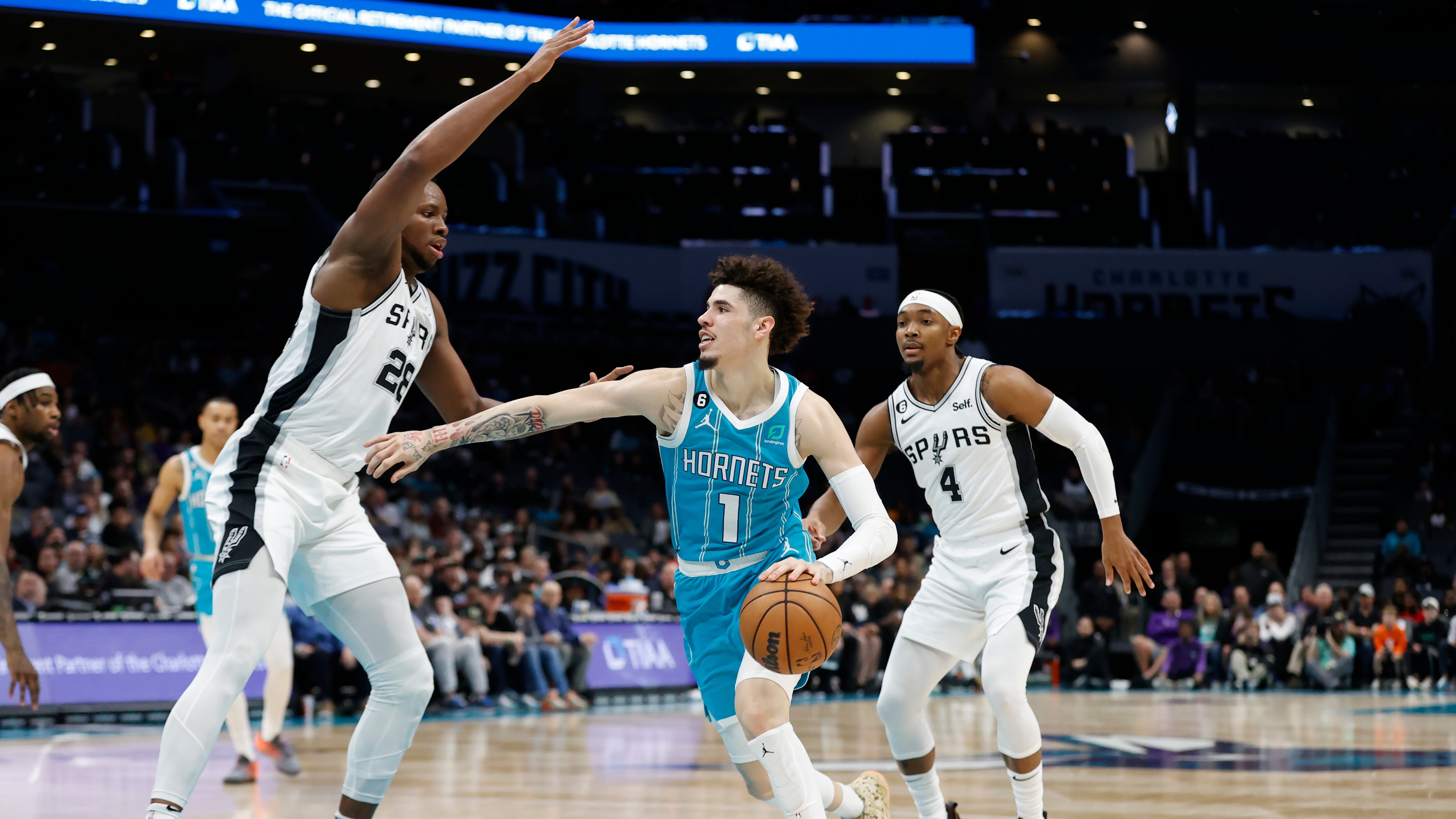 LaMelo Ball (1), de los Hornets de Charlotte, trata de superar a Charles Bassey (28), de los Spurs de San Antonio, durante la primera mitad del juego de baloncesto de la NBA el miércoles 15 de febrero de 2023, en Charlotte, Carolina del Norte. (AP Foto/B AP (Brian Westerholt/AP)