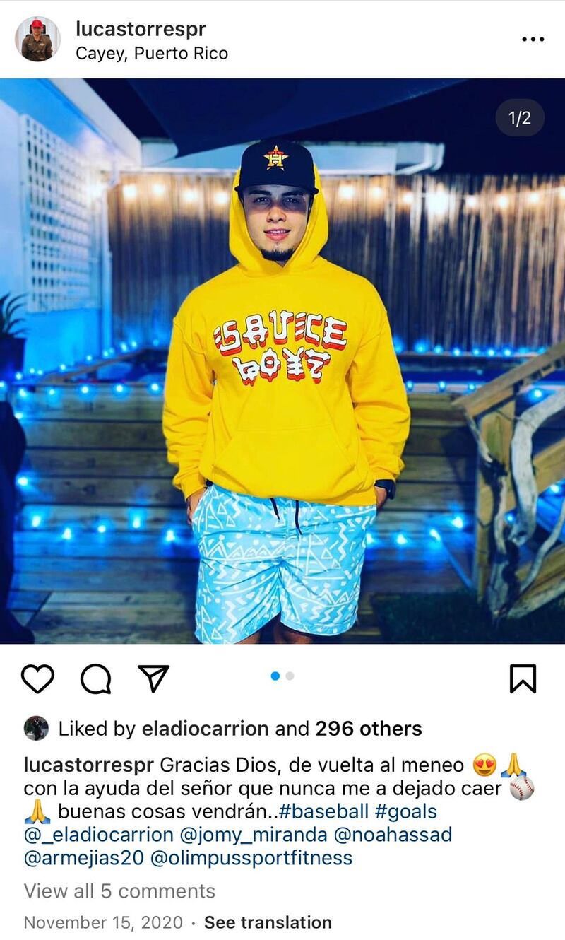 También indicó que para el año 2020, Lucas Torres, en su cuenta de Instagram publicó una fotografía donde aparece con un “hoodie” que forma parte del “merch” del álbum “Sauce Boyz” del exponente urbano Eladio Carrión quien forma parte del sello Rimas Entertainment. En la publicación, el pelotero ‘taggea’ a Noah Assad y Jonathan Miranda, ambos directivos de Rimas.