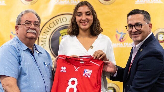 El alcalde interino del Municipio de Juana Díaz, Juan Carlos Figueroa, estuvo presente en la conferencia y junto a Trabanco hicieron entrega del uniforme a la capitana del sexteto nacional.