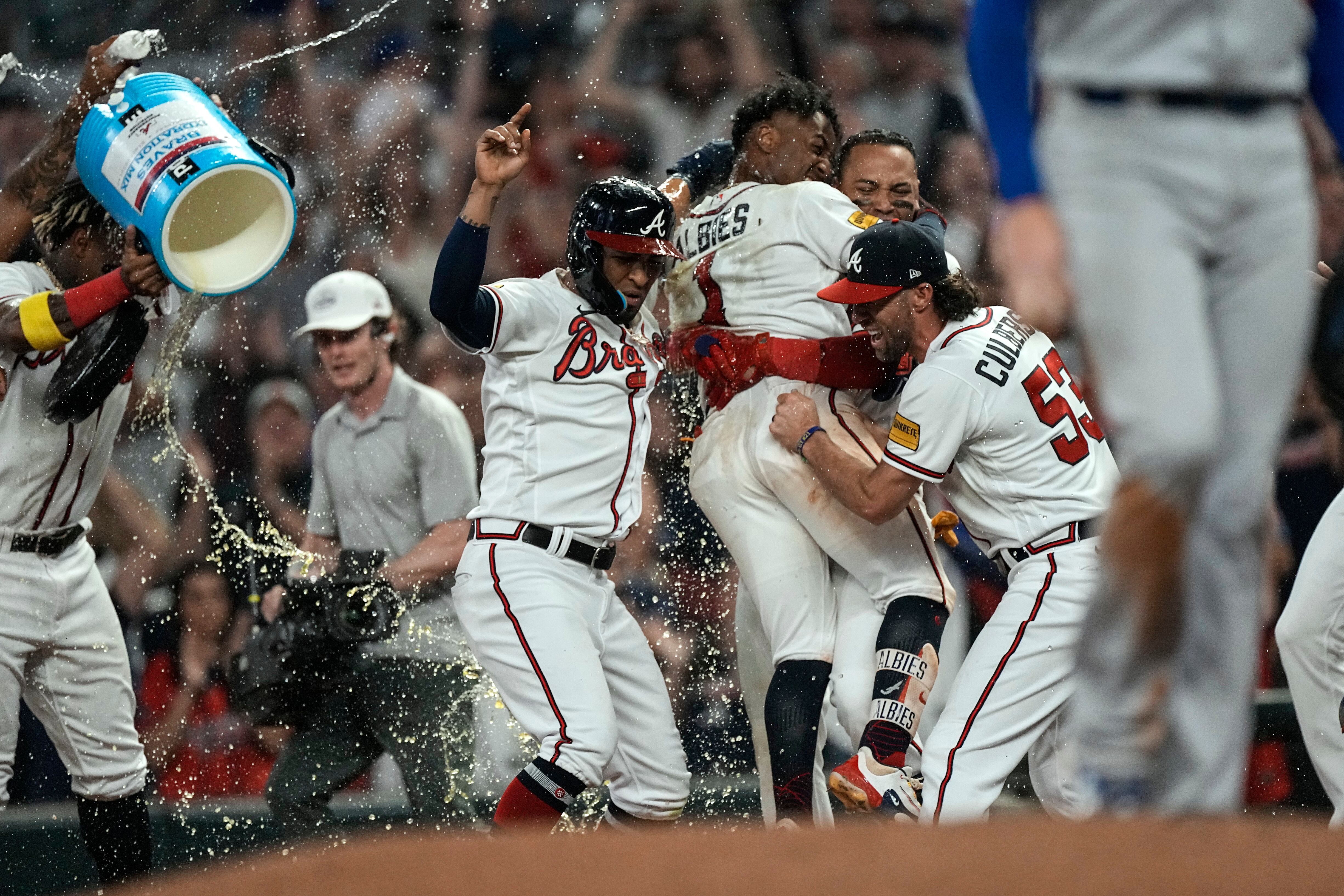 Ozzie Albies (centro) es felicitado por sus compañeros tras empujar la carrera del triunfo sobre los Dodgers de Los Ángeles, el miércoles 24 de mayo de 2023 (AP Foto/John Bazemore) AP (John Bazemore/AP)