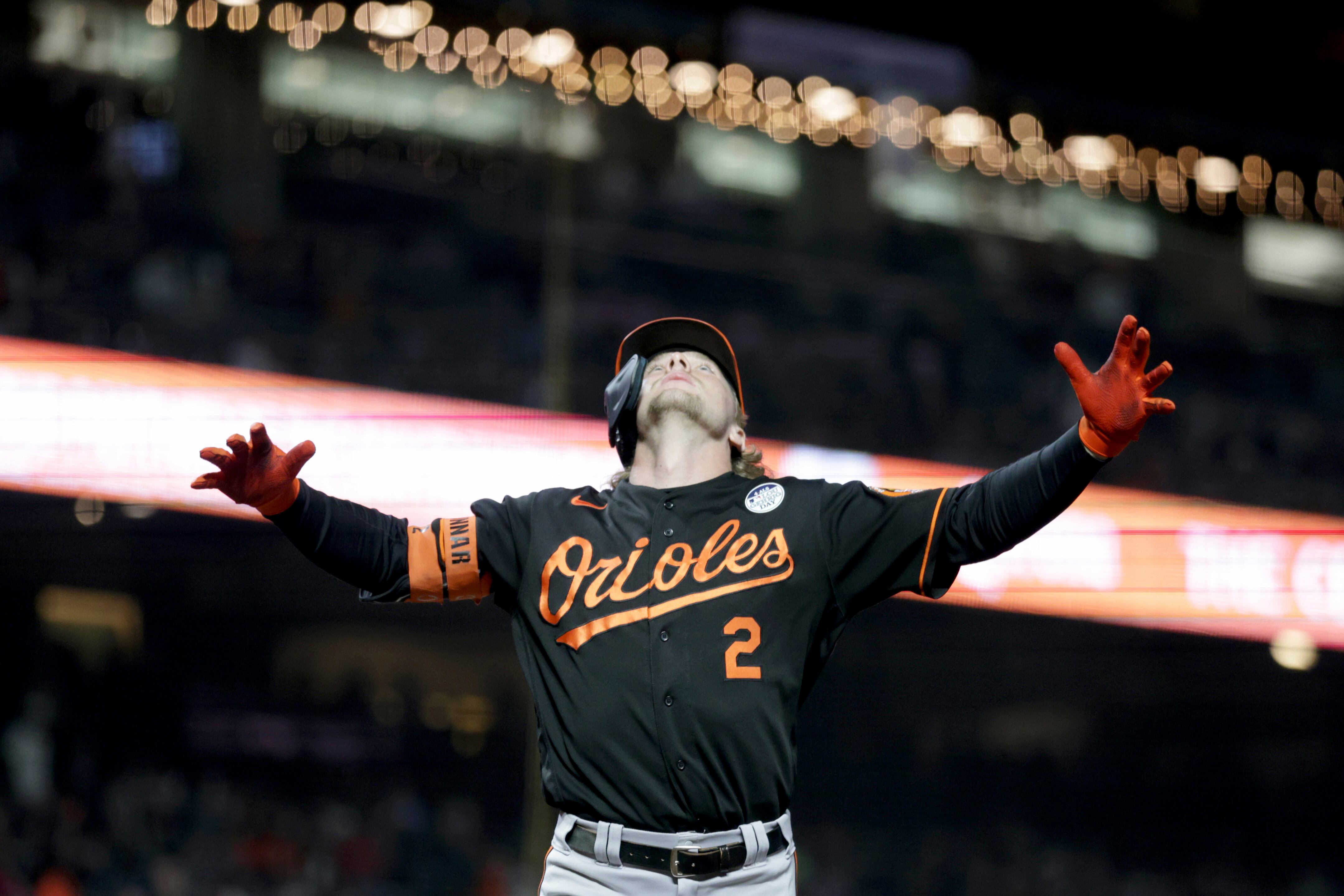 Gunnar Henderson, de los Orioles de Baltimore, festeja luego de batear un jonrón en el duelo del viernes 2 de junio de 2023, ante los Gigantes de San Francisco (AP Foto/Jed Jacobsohn) AP (Jed Jacobsohn/AP)