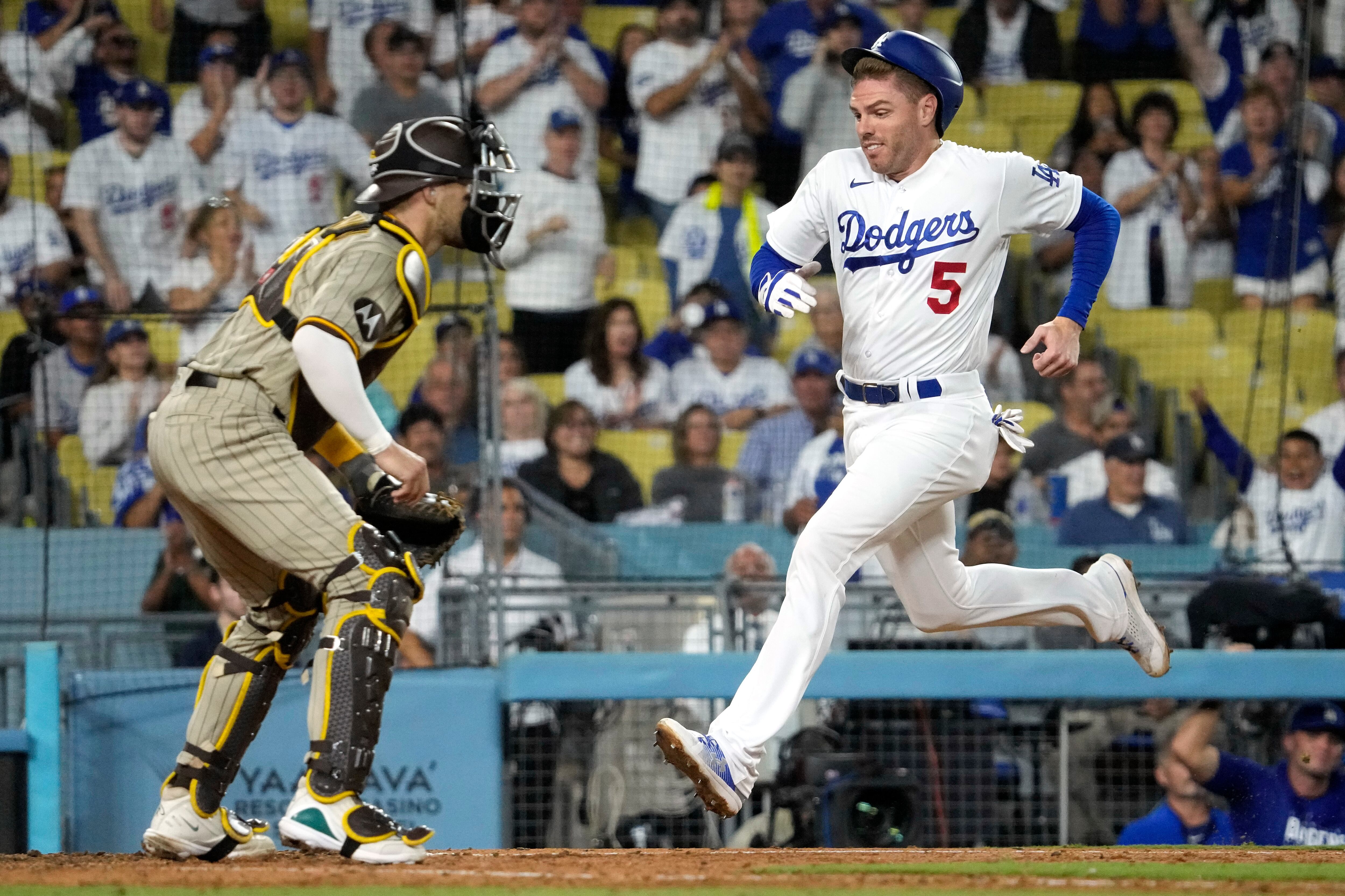 Freddie Freeman, de los Dodgers de Los Ángeles, anota en un sencillo de J.D. Martínez ante los Padres de San Diego, el martes 12 de septiembre de 2023 (AP Foto/Mark J. Terrill) AP (Mark J. Terrill/AP)