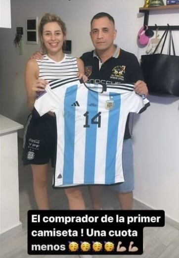 “El comprador de la primera camiseta, una cuota menos”, escribió Yésica cerca de la media noche de este miércoles en sus historias de Instagram, junto a una foto junto a la persona que adquirió la camiseta oficial de la Selección Argentina.