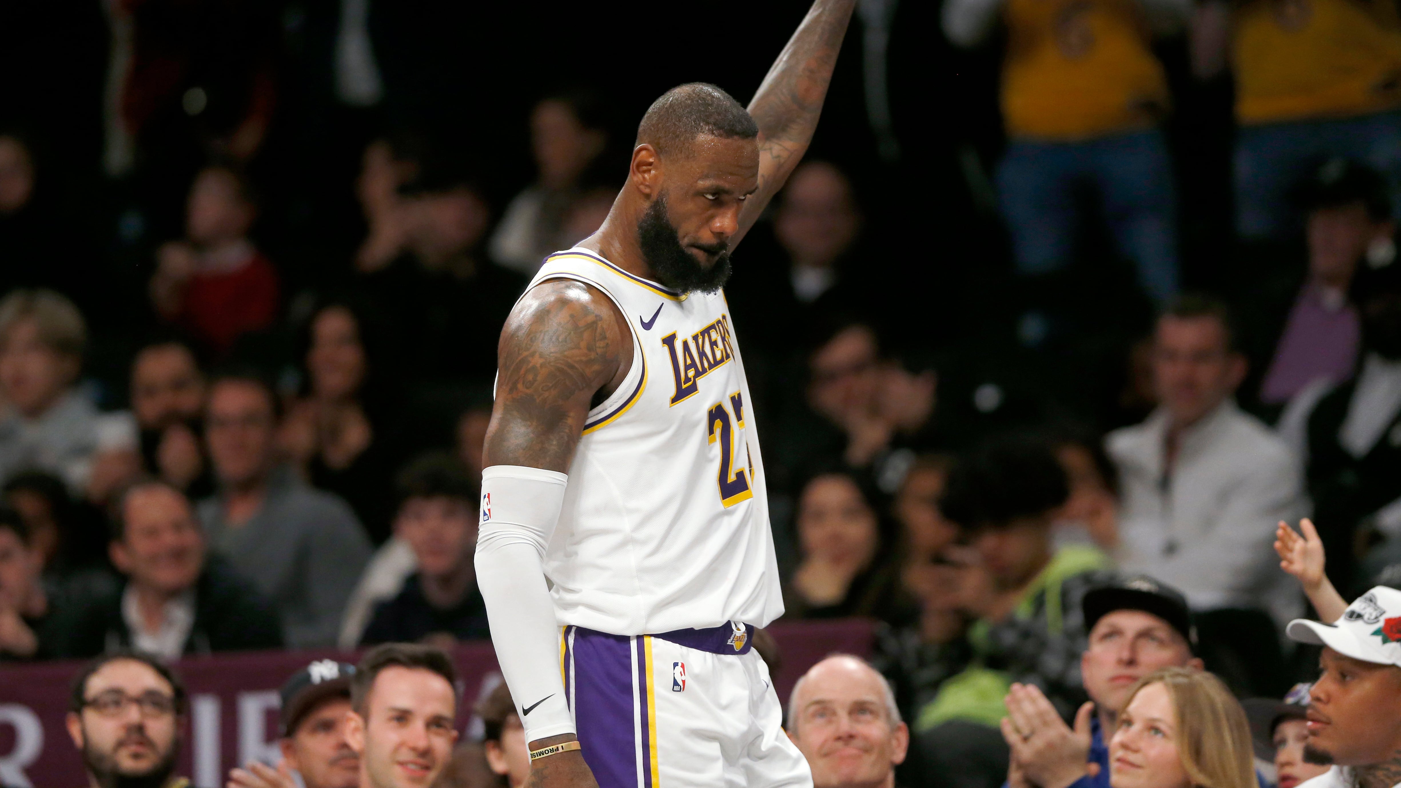 El alero de los Lakers de Los Ánngeles LeBron James recibe el reconocimiento de la fanaticada mientras se dirige al banquillo en los instantes finales del último período del juego de baloncesto ante los Nets de Brooklyn, el domingo 31 de marzo de 2024, AP (John Munson/AP)