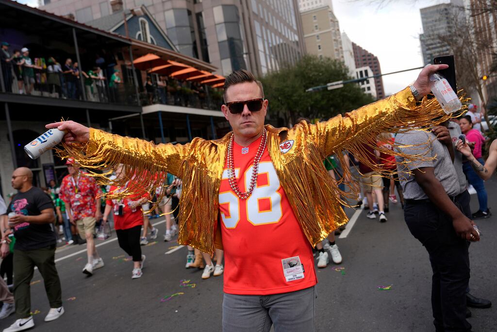 Un fanático de los Kansas City Chiefs camina en el Barrio Francés antes del Super Bowl LIX entre los Eagles y los Chiefs, el domingo 9 de febrero de 2025, en Nueva Orleans. (Julia Demaree Nikhinson/AP)