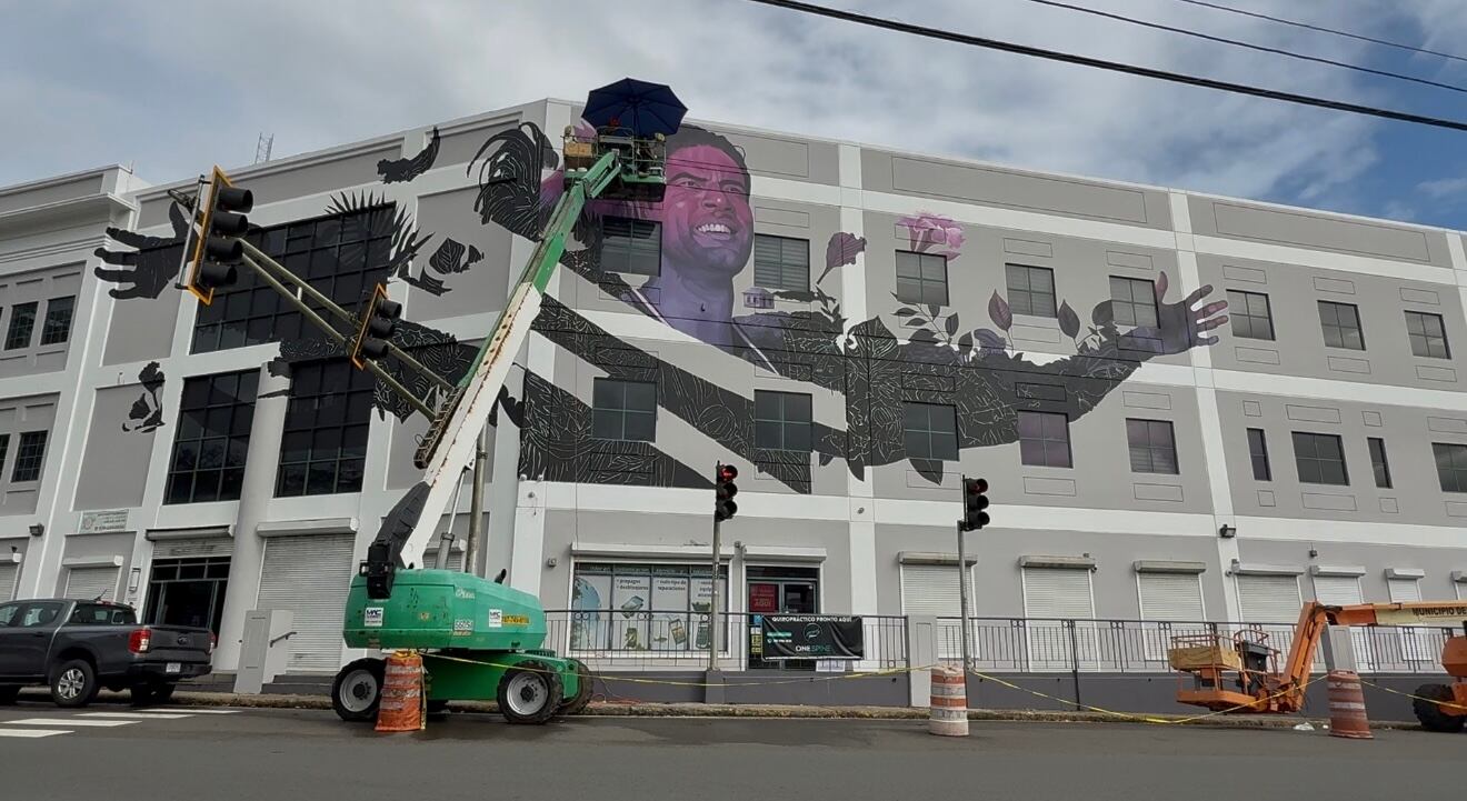El muralista David Zayas creó un enorme mural en honor a la leyenda del baloncesto José “Piculín” Ortiz en un edificio del municipio de Cayey.